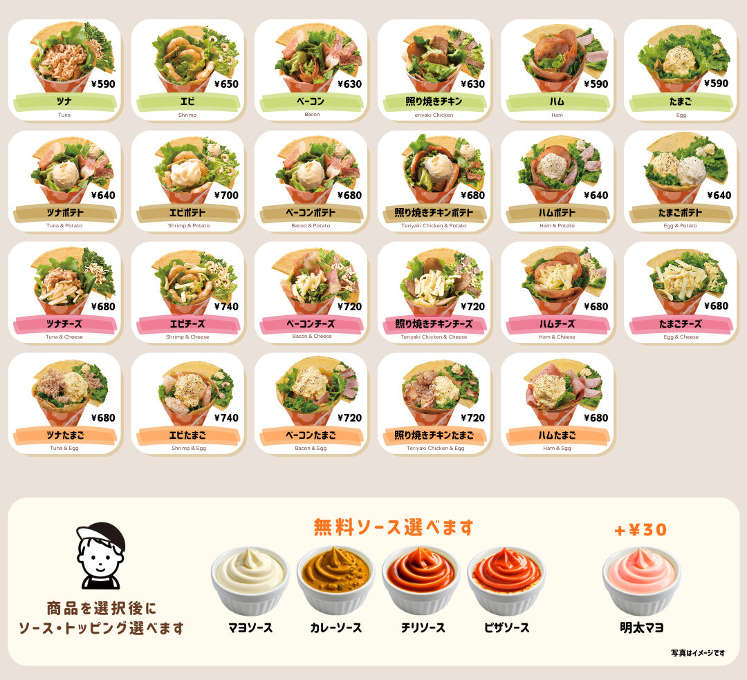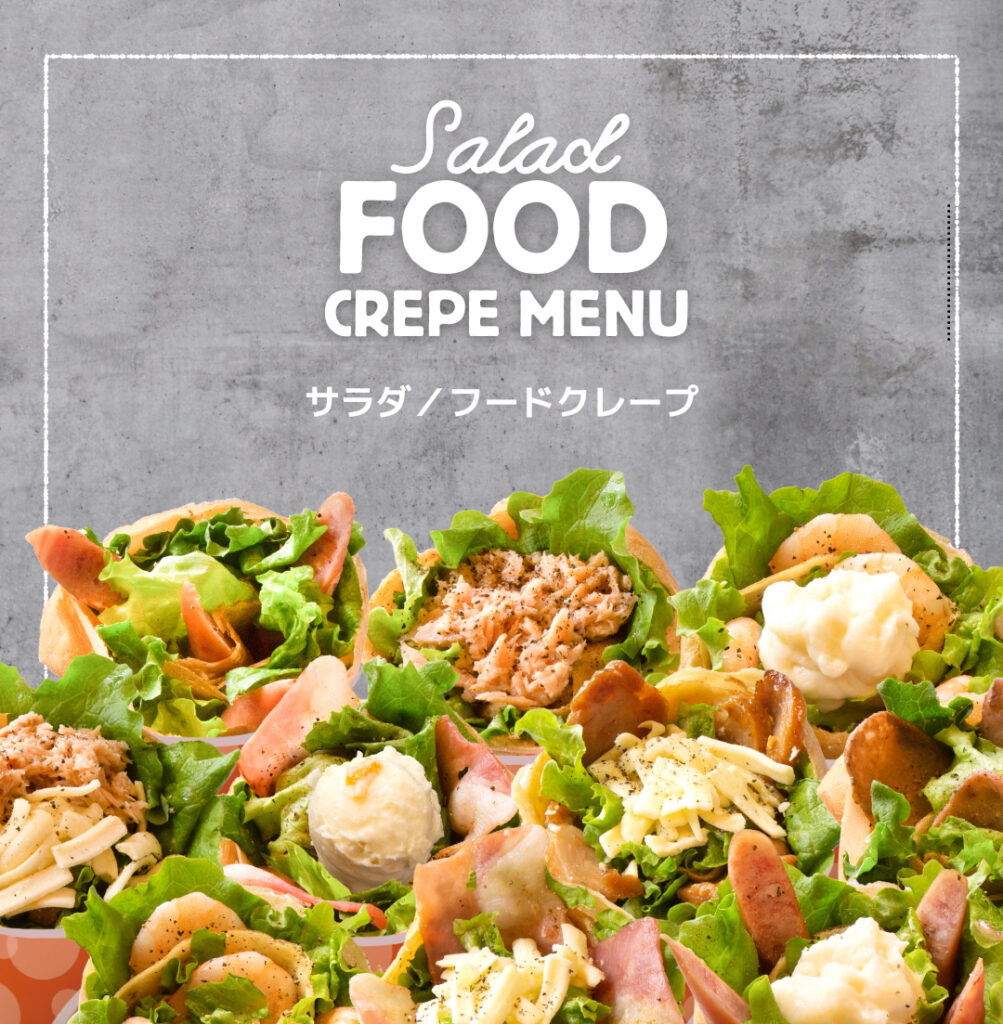 新鮮な野菜を中心に、お肉やチーズなどのおかず系具材を組み合わせたサラダクレープです。